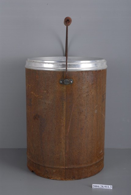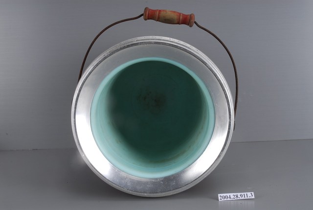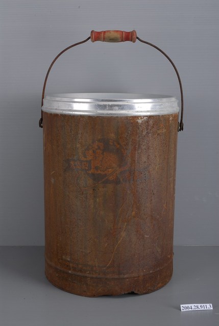 1.此件為保冰桶的桶身部分,複合材質。外部包覆鐵皮,桶身兩側以卯釘固定提架,提架上有木質手把;桶身口緣處為鋁製外框;內部為塑膠材質。因年代稍久,包覆桶身的鐵皮已嚴重鏽蝕,但仍隱約可見大象牌的商標。2.臺灣早年販賣芋仔冰的小販常使用此類保冰桶,1950年代到1970年代,尤可常見到騎著腳踏車的賣冰小販穿梭在大街小巷,其後座往往設有自製的木架,用來放置冰桶及裝冰的餅乾甜筒,搭配上俗稱叭噗的喇叭,就是吸引許多大人小孩前來購買的生財工具了。