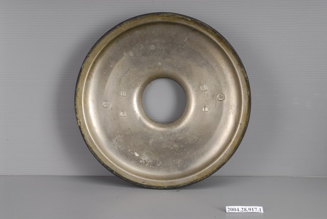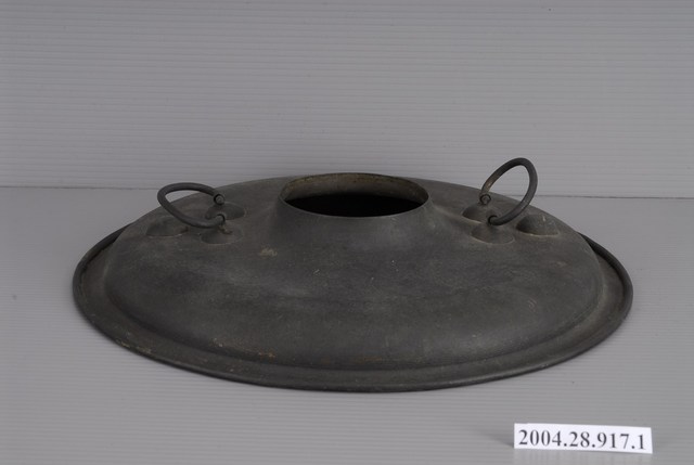 1.本件鍋蓋為銅製炭燒火鍋的部件之1,通身以銅金屬製作,鍋蓋外型呈圓盤形,表面為霧面黑褐色,內面未經氧化呈亮金屬黃色。中心處略為凸起帶有圓孔形透孔,可與鍋身的煙囪套合。蓋面呈弧面,中段兩側相對處作C形環堤把,方便鍋蓋拿取。鍋蓋外緣略為出沿反折後作圓唇,內有圓形立唇可與鍋身口緣固定。