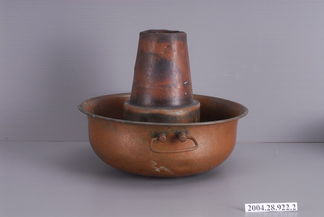 本件鍋身為紅銅炭燒火鍋的部件之2,皆以銅金屬製作,器表呈紅銅色,呈長26.6公分,寬26.7公分,高22公分。鍋身外型呈半圓形圜底,口緣處向外拗折略為折沿,兩側邊各以C型環作提把使用,鍋身內部帶有中空型的炭室,呈頂面開口,炭室與煙囪作一轉折,呈上窄下寬的圓筒樣式,炭火添加由煙囪投入,炭室底部作鏤空樣式。