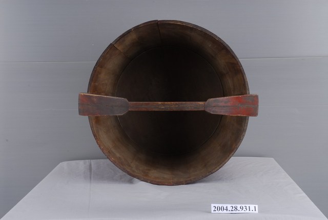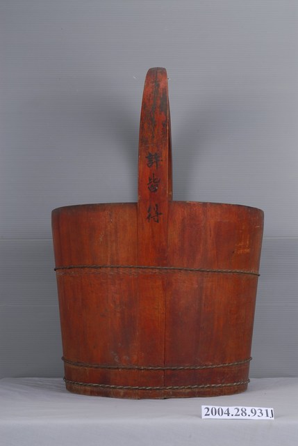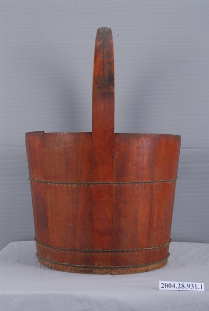 1.木製打水桶,整體器形為桶口微外擴,器身呈直筒狀,圓平底。與同組中另一只提桶相較,木材顏色偏紅。整體是由木片拼組而成,器身以木片環繞拼成圓筒,再於木桶上緣組裝提把。提桶具有使用痕跡,除底部之外,提把、桶身及桶口都遍佈碰撞擦痕,提把及桶口則積附髒污。桶身的鐵箍經久已稍微往上位移,略顯鬆脫,露出鐵絲下的木片箍痕。2.在鐵製水桶及塑膠水桶尚未普及時,臺灣常民普遍使用木製桶作為盛水用器。木材一般選用材質較堅硬的肖楠、檜木及杉木為主。拼組水桶的材料則使用竹釘,盡量避免金屬材質或黏膠,以防使用上有生鏽或溶膠的疑慮。木桶桶身使用繞捲的鐵絲箍緊,防止木片崩解而漏水。製作箍桶費力費時,一個箍桶便需耗費數日,現今相形被大量生產的鐵製品與塑膠製品給替代,木製提桶已十分少見。