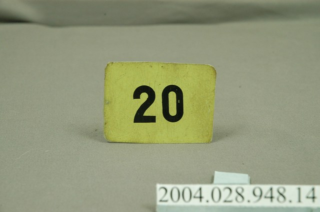 1.本物件為11與12數字日期牌。日期牌為鐵製品,是放於明通製藥工廠日曆牌上,外型為長方型,面積小於月份牌。日期牌底色已變色,無法判斷原顏色。1張日期牌上寫有2個日期,此張是19、20,19、20位於不同面。2.明通製藥工廠為現今明通化學製藥股份有限公司,成立於西元1938年的臺中水堀頭,時名為日通堂藥房,西元1947年移址後名為明通製藥社。自西元1938年創立以來,即以葫蘆標誌作為公司之標記,知名產品有治痛單液和治痛丹散等。