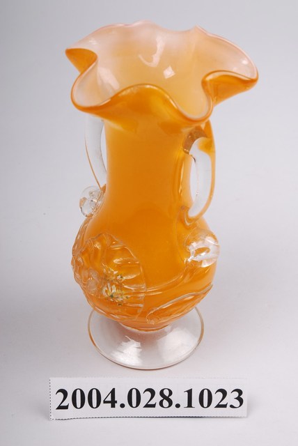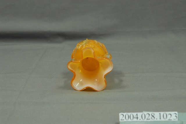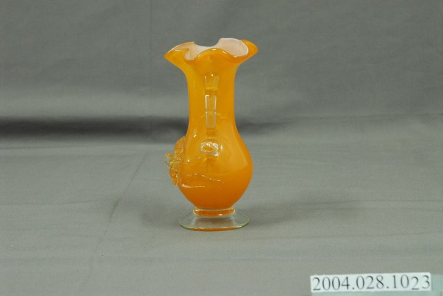1.本件橘白雙色牡丹玻璃花瓶長7.8公分,寬7.9公分,高15.1公分,整體以玻璃製作而成。器身採套料工法以手工吹製呈現外層橘色,內層白色之雙色花瓶,瓶口外侈作荷葉邊花口裝飾,頸部細長,球形垂腹,底接外僘透明覆盤式圈足。頸部兩側作透明C形耳,尾端略翹為雙孔圓環。器腹正面以透明玻璃參雜其他色料玻璃採攪料方式裝飾牡丹折枝圖樣。2.牡丹玻璃花瓶為臺灣常見花器,主要用於敬拜神明祖先時,插花使用的花供,由於玻璃呈色較為艷麗光彩,深受民眾喜愛,且價格便宜,因此產量龐大,其流行時間大約在1930至1950年代之間。花