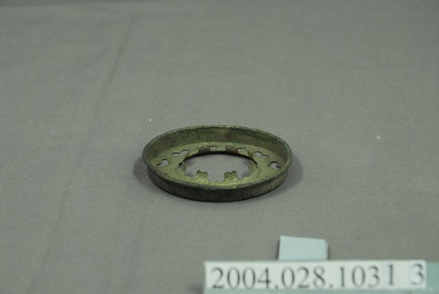 1.本件外燈罩承盤為彩繪玻璃立柱式煤油燈部件之3,以金屬製作呈淺碟狀圓形盤面,中央圓形透孔,邊緣處略為向上拗折,內緣作板狀支撐腳形排列成環,底面環繞愛心形透孔,承盤擺放位置由燈芯頭罩上套入,置於頭罩肩部固定。承盤主要功能在於放置煤油燈的玻璃外罩。2.日治時期臺灣在電器燈具尚未普及之前,多使用煤油燈具作為夜間室內照明。煤油在臺灣又稱臭油或番仔油,為當時最為經濟的照明燃料,普遍可在雜貨店購買,其缺點為燃燒時產生的黑煙與臭味。煤油燈樣式多元,最簡單為玻璃瓶插入燈芯固定即可使用,多功能具防風以及造型之燈具,多為社會階層較高之家庭使用。