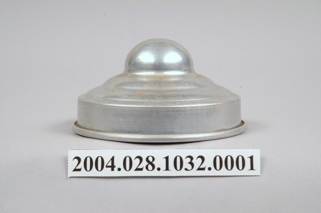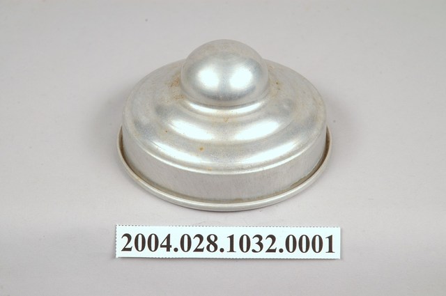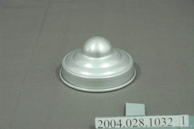 此件糖果罐蓋由鋁質一體成形製成,整體呈圓錐型,中央有半圓形弧狀突起,其直徑約占整個蓋面直徑三分之一寬,外圈飾以兩層同心圓微凸造型,並漸進式向下傾斜,至邊緣垂直向下形成套住玻璃瓶身的部分,蓋緣向外反摺呈滾邊。