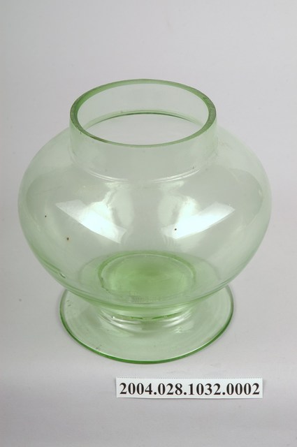 此件糖果罐瓶身由草綠色玻璃製成,顏色乾淨清透,應是戰後時期的玻璃工藝產品,整體型態渾圓飽滿。瓶口呈俐落直筒狀,正好於瓶蓋內側接合。瓶身呈滑肩鼓腹,向外鼓起呈圓弧形倒圓錐狀向下,於器身交接處內縮,底部向外擴散成圓形扁盤底座。