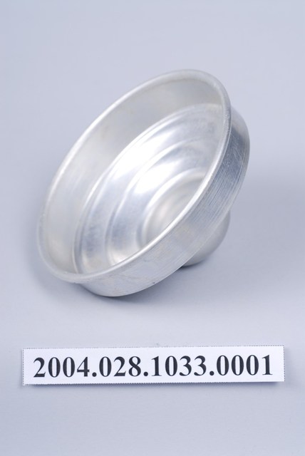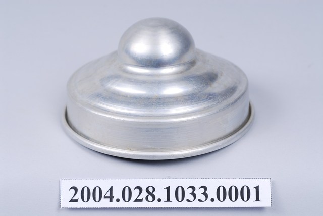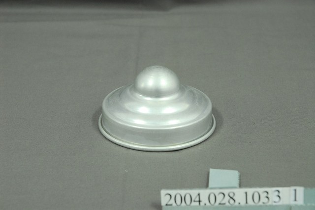 此件糖果罐蓋由鋁質一體成形製成,整體呈圓錐型,中央有半圓形弧狀突起,其直徑約占整個蓋面直徑三分之一寬,外圈飾以兩層同心圓微凸造型,並漸進式向下傾斜,至邊緣垂直向下形成套住玻璃瓶身的部分,蓋緣向外反摺呈滾邊。