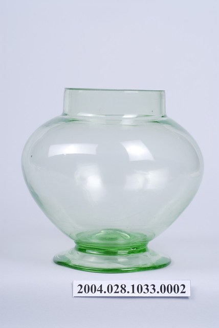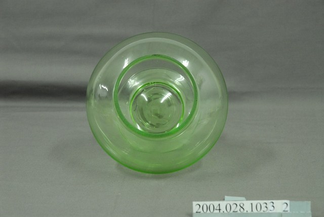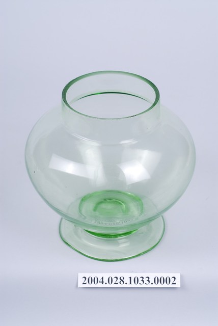 此件糖果罐瓶身由草綠色玻璃製成,顏色乾淨清透,應是戰後時期的玻璃工藝產品,整體型態渾圓飽滿。瓶口呈俐落直筒狀,正好於瓶蓋內側接合。瓶身呈滑肩鼓腹,向外鼓起呈圓弧形倒圓錐狀向下,於器身交接處內縮,底部向外擴散成圓形扁盤底座。
