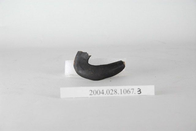 本件為木雕千里眼神像之斷裂飄帶,千里眼身上披掛飄帶,能使神像表現出活潑動態的造型。又因木雕,容易碰撞導致斷裂。並可見神像原為安金,日後燻黑的動態過程。原有飄帶造型,可參考登錄號2004.028.1068之木雕順風耳神像,兩尊為同一對祀神。