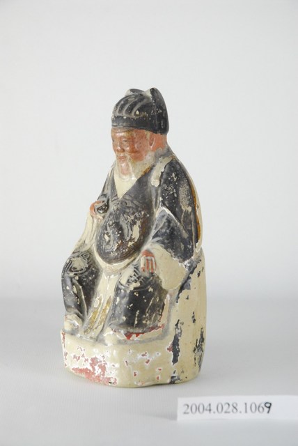 土地公又稱福德正神,部分地區也稱為伯公、后土、社神、土地神等。土地公傳說眾多,一般人生前行善,死後亦有被封為土地公者。土地公不僅掌一境之地,也被視為是文財神。本件土地公為泥塑土地公頭戴冠帽,身著壽字員外服,右手持金元寶,粉臉白髯,端坐圈椅。正面手部以下以及背面已有多處塗層脫落。