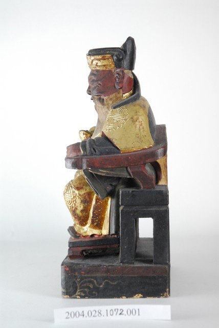 土地公又稱福德正神,部分地區也稱為伯公、后土、社神、土地神等。土地公傳說眾多,一般人生前行善,死後亦有被封為土地公者。土地公不僅掌一境之地,也被視為是文財神。土地公頭戴員外帽,身著金色刻有鶴紋及壽字紋的朝服,右手持金元寶,端坐圈椅上,座椅底座以黑色為底色,刻有花藻紋。整體刻工精細,呈現土地公掌握財富的一面。