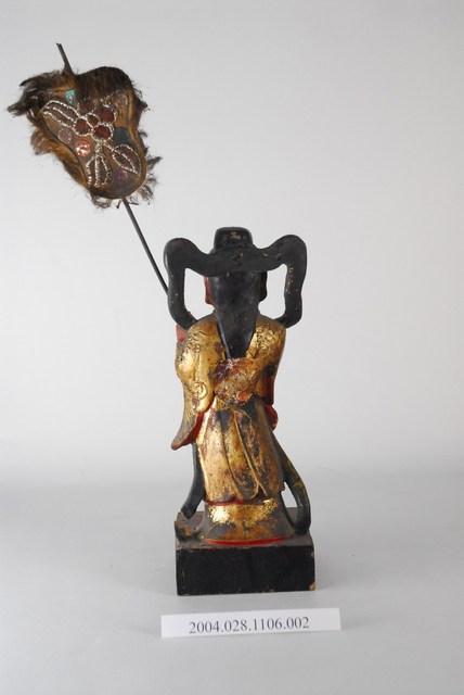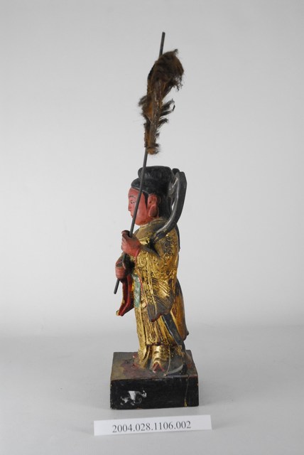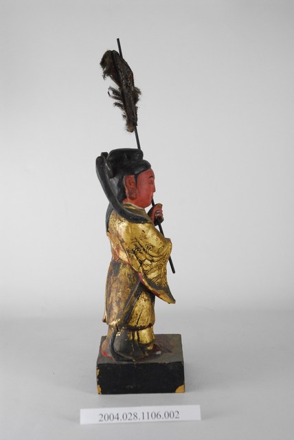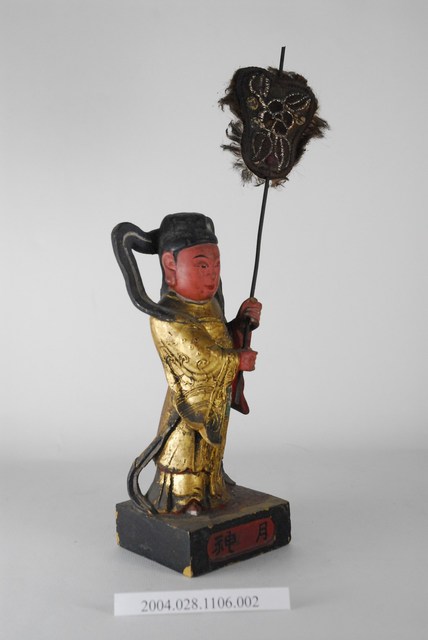 本件為木雕月神神像,站姿方形底座,底座橫書月神。神像束髮粉臉雙眼微張微笑貌,宮娥形象手執一個長柄扇。左邊身後飄帶斷裂。月神屬於自然崇拜,月神是代表月亮,將其神格化。