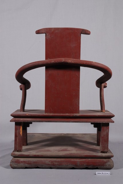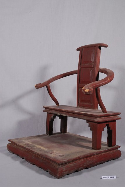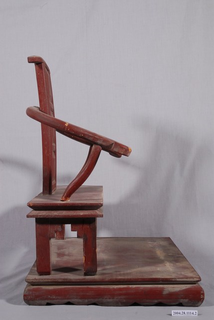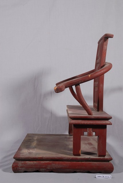 1.本件是關聖帝君神像的木製座椅,漆成棗紅色,椅手作如意紋,表面有破損,其他構件皆素面無紋飾,座椅下為底座。