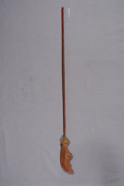 1.本物件為泥塑加彩立姿周倉神像之關刀,刀柄與刀身皆木製,原神像雙手橫於胸前作握刀狀,惟關聖帝君的青龍偃月刀已不見。在小說《三國演義》中,青龍偃月刀為關羽所使用的兵器,書中描述青龍偃月刀重八12斤,又名冷艷鋸,關羽用其斬殺了不少武將,所以後世也稱青龍偃月刀為關刀。