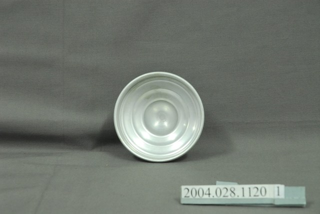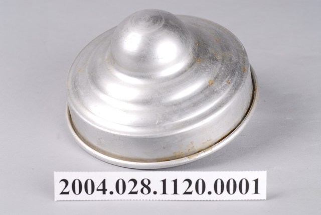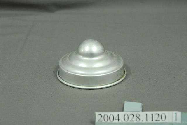 此件糖果罐蓋由鋁質一體成形製成,整體呈圓錐型,中央有半圓形弧狀突起,其直徑約占整個蓋面直徑三分之一寬,外圈飾以兩層同心圓微凸造型,並漸進式向下傾斜,至邊緣垂直向下形成套住玻璃瓶身的部分,蓋緣向外反摺呈滾邊。