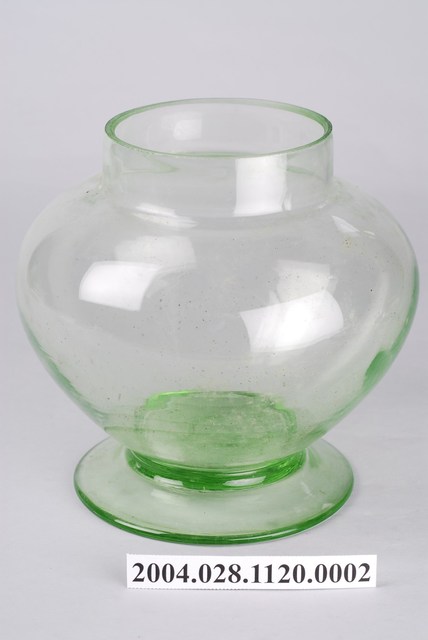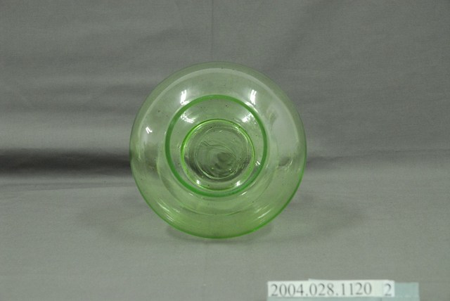 此件糖果罐瓶身由草綠色玻璃製成,顏色乾淨清透,應是戰後時期的玻璃工藝產品,整體型態渾圓飽滿。瓶口呈俐落直筒狀,正好於瓶蓋內側接合。瓶身呈滑肩鼓腹,向外鼓起呈圓弧形倒圓錐狀向下,於器身交接處內縮,底部向外擴散成圓形扁盤底座。