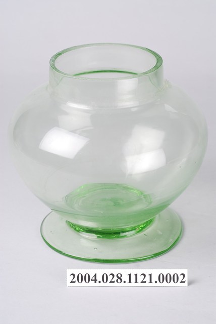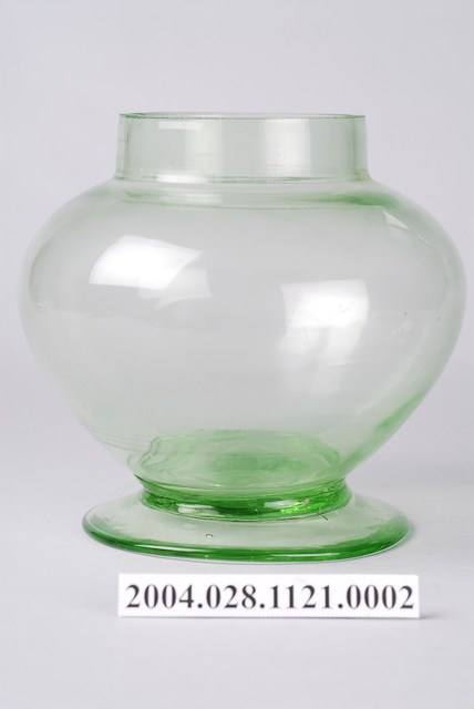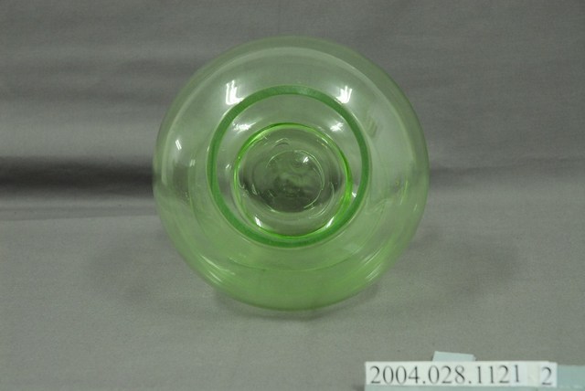 此件糖果罐瓶身由草綠色玻璃製成,顏色乾淨清透,應是戰後時期的玻璃工藝產品,整體型態渾圓飽滿。瓶口呈俐落直筒狀,正好於瓶蓋內側接合。瓶身呈滑肩鼓腹,向外鼓起呈圓弧形倒圓錐狀向下,於器身交接處內縮,底部向外擴散成圓形扁盤底座。