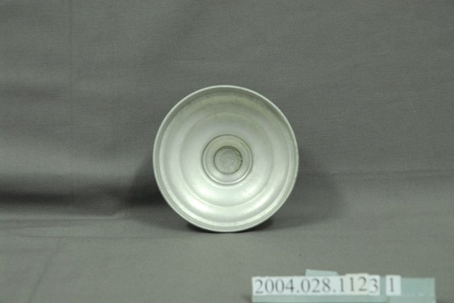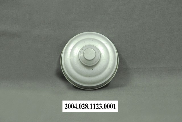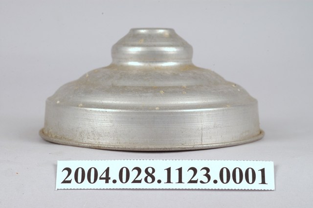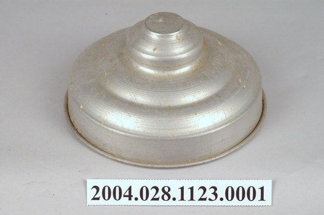 此件糖果罐蓋由鋁質一體成形製成,長約10.9公分,寬約10.7公分,高約5.1公分。整體呈圓錐型,中央以同心圓突起兩層為鈕,其直徑約占整個蓋面直徑三分之一寬,外圈飾以一層同心圓微凸造型,並漸進式向下傾斜,至邊緣垂直向下形成套住玻璃罐身的部分,蓋緣向外反摺呈滾邊。