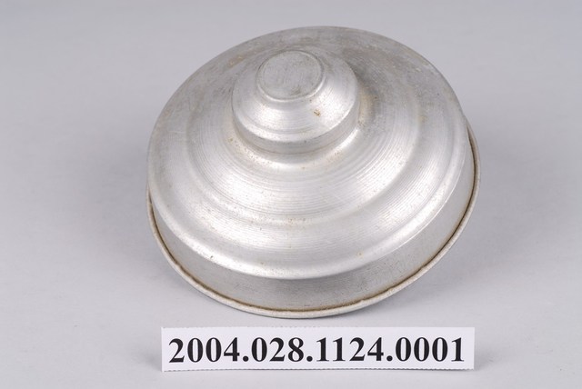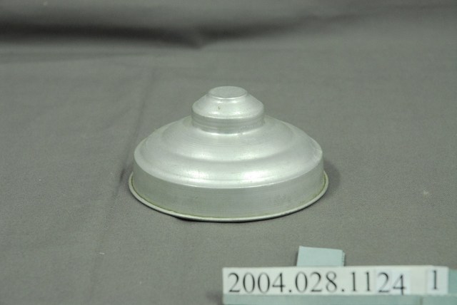 此件糖果罐蓋由鋁質一體成形製成,長約10.8公分,寬約10.9公分,高約5.1公分。整體呈圓錐型,中央以同心圓突起兩層為鈕,其直徑約占整個蓋面直徑三分之一寬,外圈飾以一層同心圓微凸造型,並漸進式向下傾斜,至邊緣垂直向下形成套住玻璃罐身的部分,蓋緣向外反摺呈滾邊。
