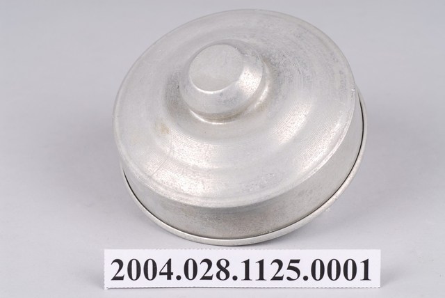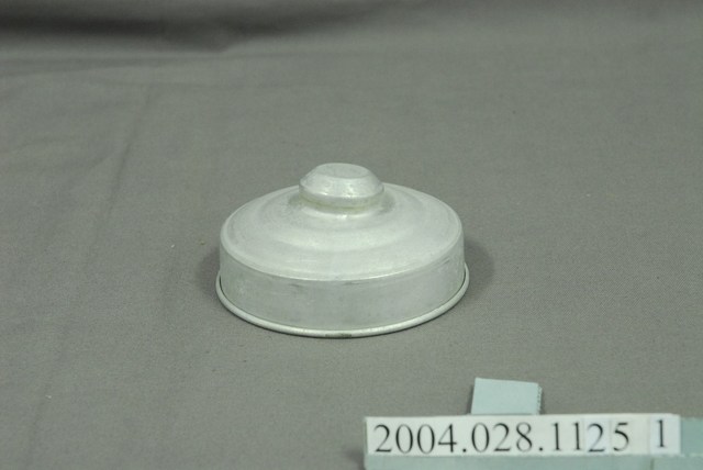此件糖果罐蓋由鋁質一體成形製成,直徑約9.3公分,高約4.3公分。整體呈圓錐型,中央以同心圓突起呈平頂倒椎型為鈕,其直徑約占整個蓋面直徑三分之一寬,外圈飾以一層同心圓微凸造型,並漸進式向下傾斜,至邊緣垂直向下形成套住玻璃罐身的部分,蓋緣向外反摺呈滾邊。