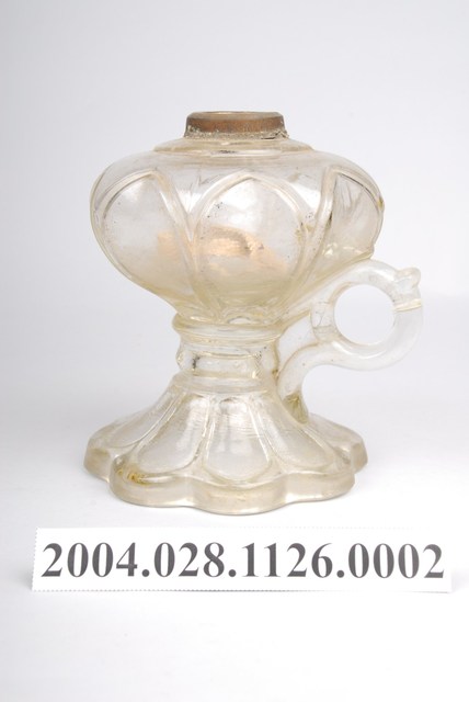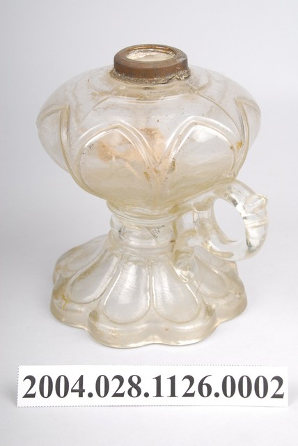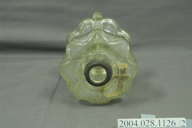 1.本件煤油壺為花瓣紋玻璃煤油燈部件之2,煤油壺通身以透明玻璃製作,兼作造型底座功能。外型呈細口短頸,口緣以銅片包覆,平肩鼓腹,器身於中段收腰,底座呈倒置喇叭口,腰部帶有垂直立環,方便持拿移動。煤油壺上半部以類似蓮花花瓣作紋路裝飾,底座處同樣以花瓣作喇叭花口。2.臺灣在電器燈具尚未普及之前,多使用煤油燈具作為夜間室內照明。煤油在臺灣又稱臭油或番仔油,為當時最為經濟的照明燃料,普遍可在雜貨店購買,其缺點為燃燒時產生的黑煙與臭味。