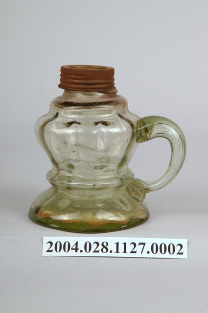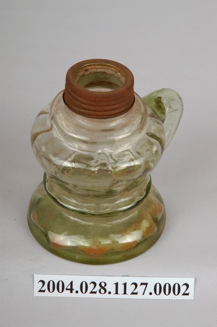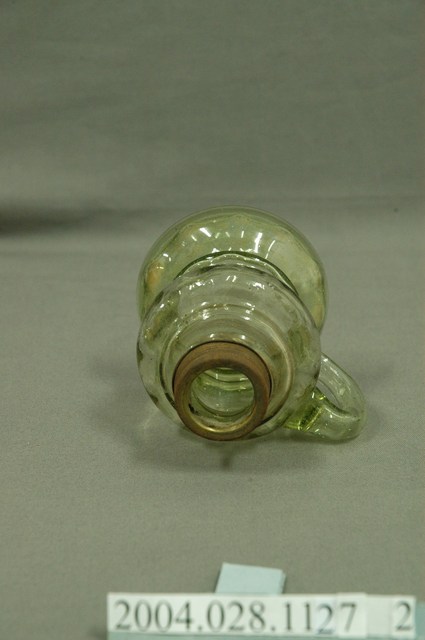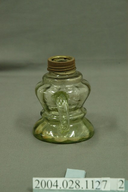 1.本件煤油壺為淡綠透明玻璃煤油燈之2,煤油壺通身以淡綠色透明玻璃製作,兼作造型底座功能。外型呈細口短頸,口緣以帶有螺旋線槽的鐵片包覆,折肩斜腹,器身於中下段收腰,底座呈倒盤狀,由肩部至腰部帶有垂直立環,方便持拿移動。煤油壺上半部表面以瓜稜紋裝飾。2.臺灣在電器燈具尚未普及之前,多使用煤油燈具作為夜間室內照明。煤油在臺灣又稱臭油或番仔油,為當時最為經濟的照明燃料,普遍可在雜貨店購買,其缺點為燃燒時產生的黑煙與臭味。