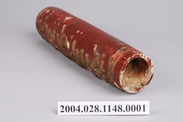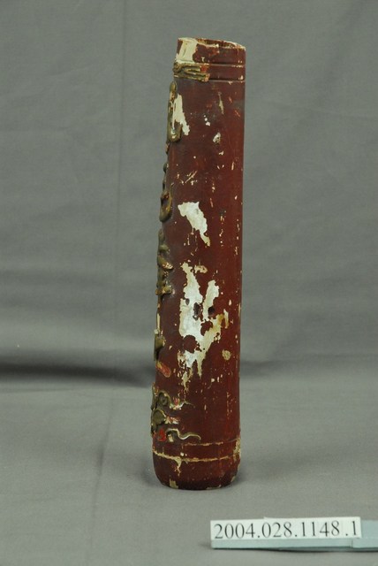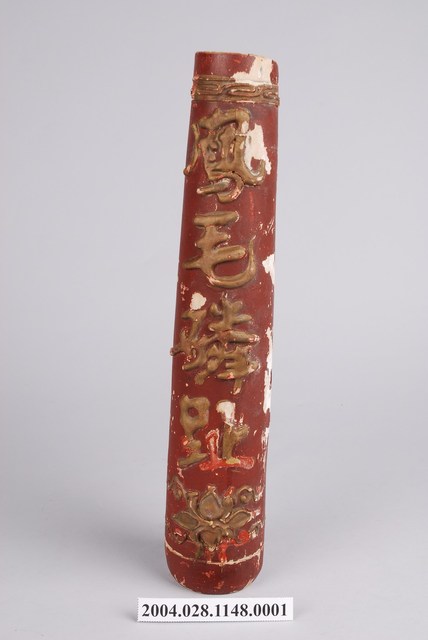 1.本件「鳳毛麟趾」木雕蠟燭為朱漆線金木雕蠟燭對組之部件1,主要作祭祀用具,其造型呈圓柱狀,頂端略帶束口,頂面內挖淺槽。木雕蠟燭以粉線土技法裝飾上端的回字紋,中央書寫四字對聯「鳳毛麟趾」意為珍貴稀少,下端為蓮花圖樣,再以白灰打底後,塗上朱漆顏料,粉線處另外以金漆裝飾。本件木雕蠟燭頂端凹槽應放置替代火光的木構件,整件固定於燭臺之上。2.蠟燭為臺灣傳統祭祀供品中的五供(香、花、燈、燭、果)之一,因此安置蠟燭供神的燭臺也受到重視,通常成對出現。較為考究的燭臺供器會於基座之上安裝木雕蠟燭,並在燭身裝飾蟠龍,稱為龍燭。