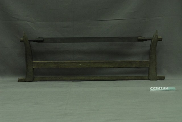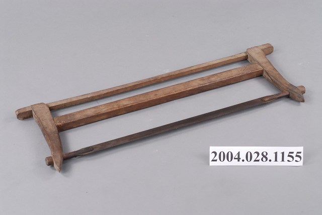 本文物為臺灣鋸,又稱框鋸、拐鋸、架鋸,是木作司傅使用的臺灣傳統鋸,為與日本鋸區隔而稱為臺灣鋸。木鋸框為二層架形式,連接鋸片兩端為圓形握柄夾桿,可旋轉以調整鋸片角度。與鋸條垂直的兩端木條為握柄。與鋸條平行的木條,近端為調整桿,以鐵鎚敲擊移動調整桿,可鬆開或夾緊夾桿,以調整鋸條角度;遠端為支撐桿,兩端與握柄相嵌,形成固定的支撐結構。本件以平頭鐵釘固定夾桿與鋸條,鐵釘為1950年代以後材料。臺灣鋸為推鋸,使用時手握握桿,向下推出時施力,拉回時則輕拉。