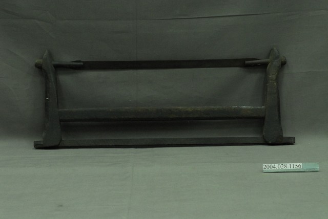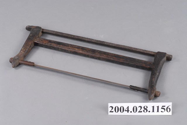 本文物為臺灣鋸,又稱框鋸、拐鋸、架鋸,是木作司傅使用的臺灣傳統鋸,為與日本鋸區隔而稱為臺灣鋸。木鋸框為二層架形式,連接鋸片兩端為圓形握柄夾桿,可旋轉以調整鋸片角度。與鋸條垂直的兩端木條為握柄。與鋸條平行的木條,近端為調整桿,以鐵鎚敲擊移動調整桿,可鬆開或夾緊夾桿,以調整鋸條角度;遠端為支撐桿,兩端與握柄相嵌,形成固定的支撐結構。本件以平頭鐵釘固定夾桿與鋸條,鐵釘為1950年代以後材料。臺灣鋸為推鋸,使用時手握握桿,向下推出時施力,拉回時則輕拉。