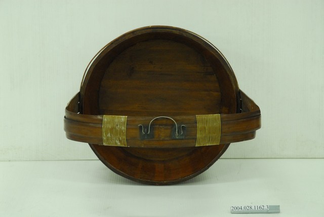 本件以數片木片拼接成層底、邊圍框部、圈足部,呈圓形。整體呈原木色,外側邊圍框部以金色漆勾繪出人物、舟船、江島、樹木等紋飾,因年代久遠,金漆多有脫落磨損的狀況;圈足部以金色漆勾繪出左右對稱的草紋與花朵;提柄以三條長竹片彎曲成ㄇ字形,頂部內側再加上一厚竹片並以藤皮繞纏加固,頂部外側加銅把;提柄兩端固定在外側邊框部,呈扇狀,分別有六個打釘加固與鎖墊片的結構;構成提柄的中間長竹片上,左右外側各寫有「乙卯秋月」、「家常俻用」的字樣。