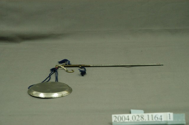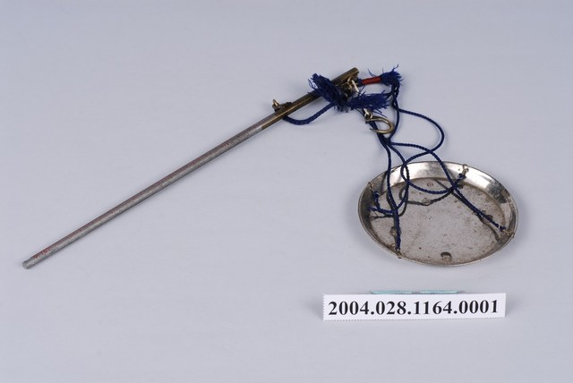 本物件為藥秤,金屬製品。藥秤可分成三部分,秤稈、圓形秤盤與秤鉤,秤盤和秤稈用藍線綁住連接。