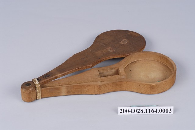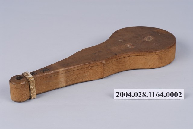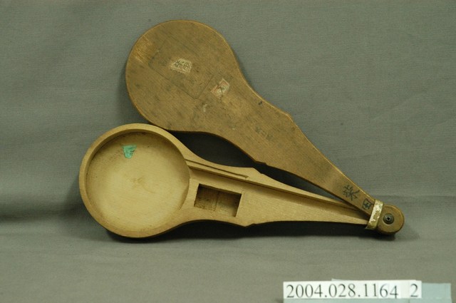 本物件為木盒。木盒外型似吉他狀,主體可分成蓋子與盒身,兩者於頂端以螺絲固定在一起,開合方式是左右滑開。頂端處寫有「柴田」黑色字體。盒子內部有3個空間,分別為放秤盤、放秤稈和放砝碼的空間。