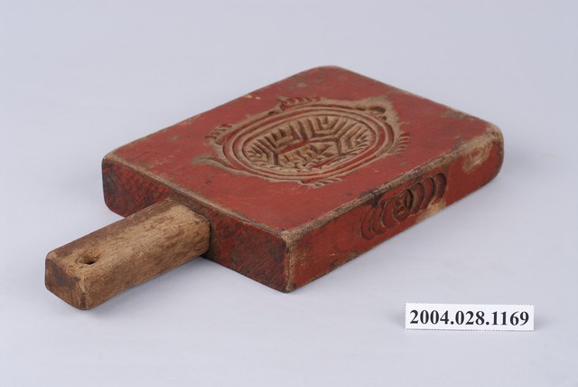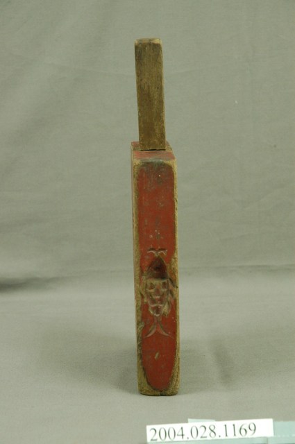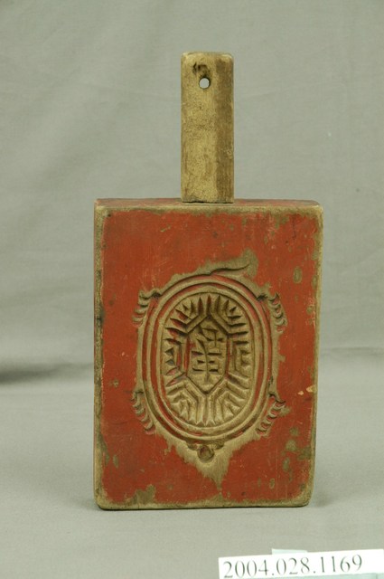1.此印模模板上刷有朱漆,推測應是嫁妝之物。一寬面刻帶葉圓形桃與銀圓並列紋,象徵富貴與長壽,圓桃內部中間雕有蓮花紋飾,銀圓則雕簡易花紋為裝飾。另一寬面刻象徵長壽的龜紋,龜身外緣刻有頭、尾、五根張爪的前腳,四根張爪的後腳,龜甲由外至內共三圈,內圈刻甲殼紋,中央一六角框,框內為「壽」字。一窄側邊雕刻魚紋,象徵「年年有餘」。另一窄側邊刻有七個古代銅錢所組成的連錢紋,象徵「財富連綿」。握柄方形短直,未塗朱漆,尾端鑽有一小孔,為方便吊掛之用。此模具因經久使用,邊角與紋飾周邊部分的朱漆多已脫落,且有多處磨損與部分裂痕