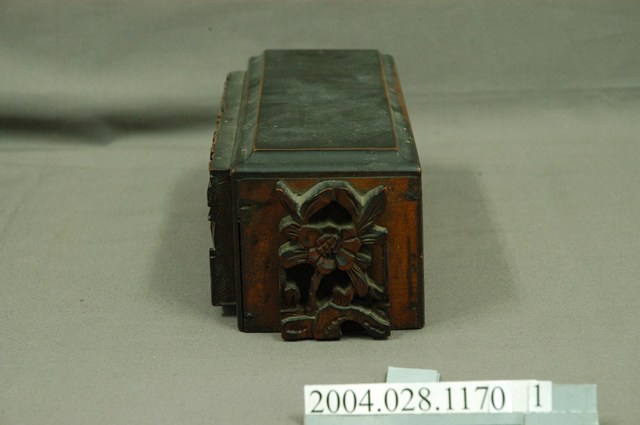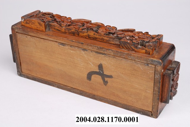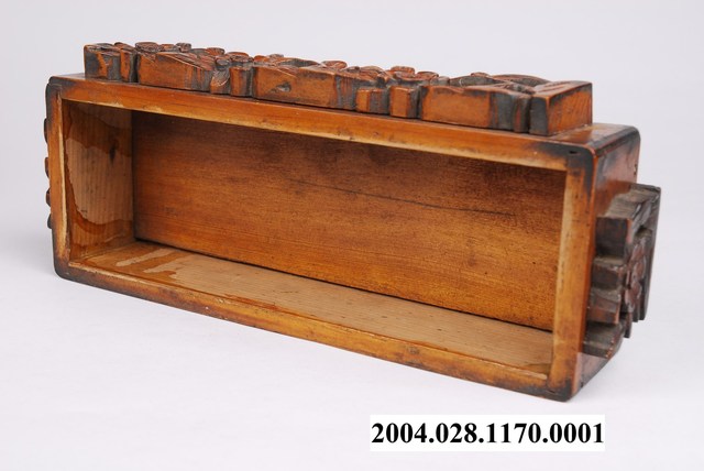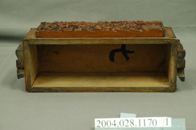 薦盒又稱敬盒、薦臺、奉案或「順盒仔」,為盛放供品的用具承台,一般用來放置酒杯和水杯,以供奉神明。本件為平頭雙層式薦盒底座,內有書寫一「七」字。前葉及兩側皆用花枝紋裝飾。