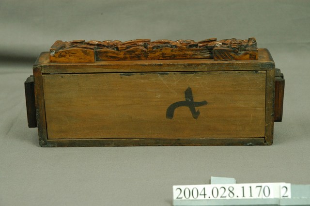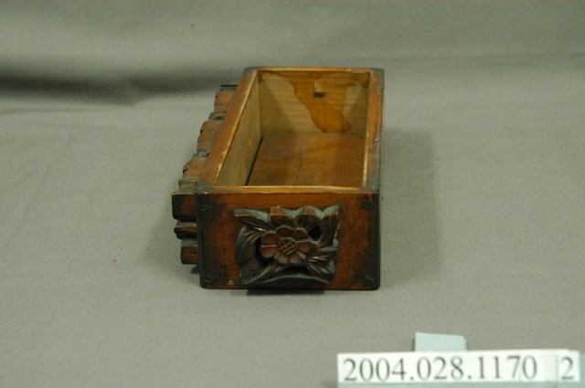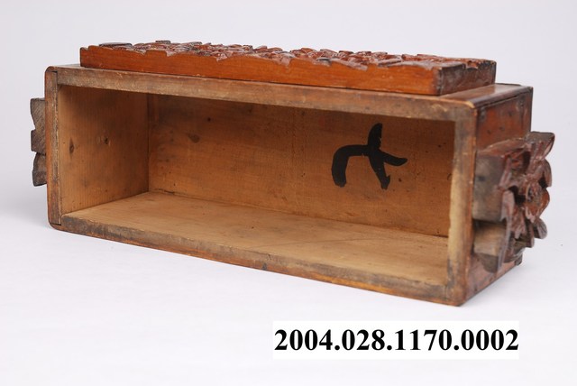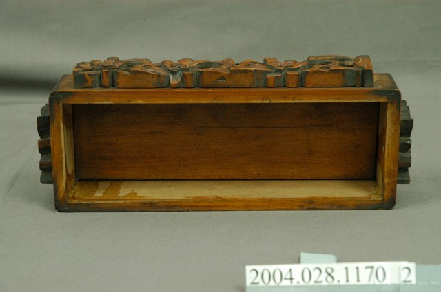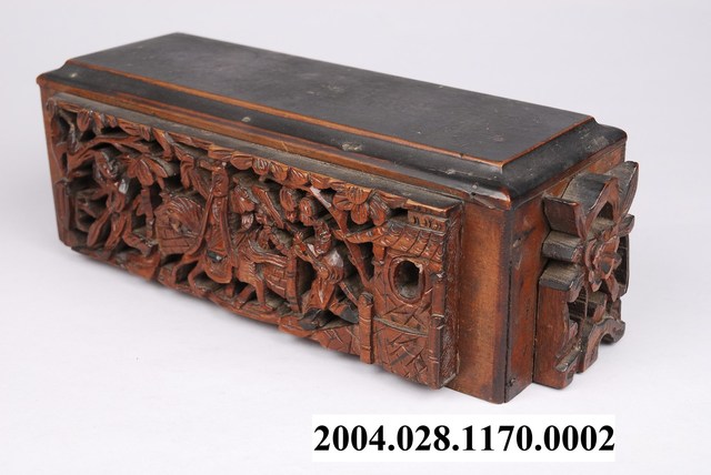 薦盒多以木器、漆器,陶瓷或錫等材質製成,其中以木製品為主,且多有精緻的雕刻。本件為平頭式雙層薦盒的上蓋,內可藏酒杯,使用時取下置於下蓋後方,可形成雙層臺座,上蓋可放三個酒杯。前業以主僕騎馬圖裝飾,側面則為花枝圖紋。