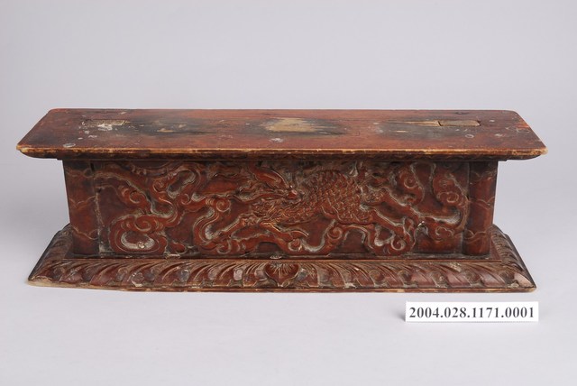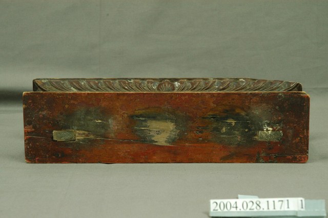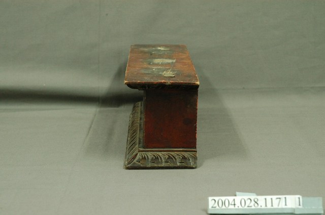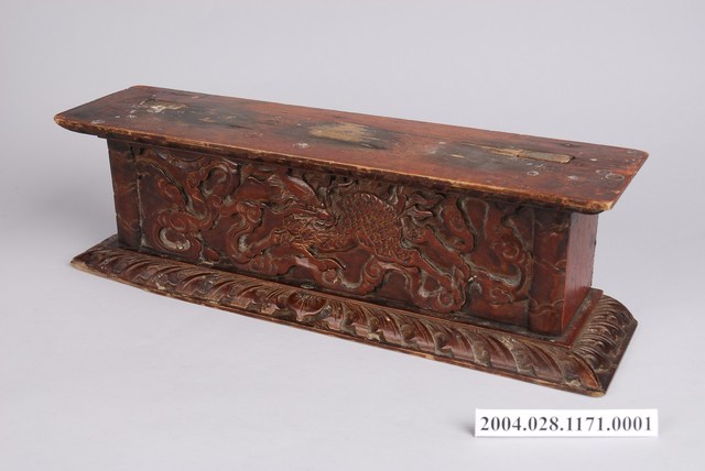 薦盒又稱敬盒、薦臺、奉案或「順盒仔」,為盛放供品的用具承臺,一般用來放置酒杯和水杯,以供奉神明。薦盒多以木器、漆器,陶瓷或錫等材質製成,其中以木製品為主,且多有精緻的雕刻。本件為木製平頭單層式薦盒,以麒麟彩雲圖為裝飾,底座座沿則以核果圖紋裝飾。