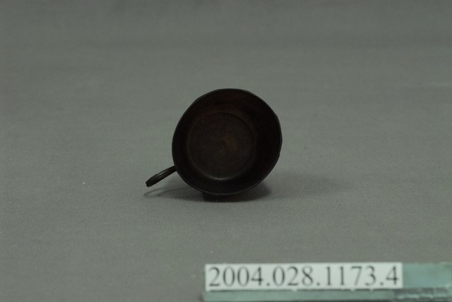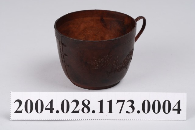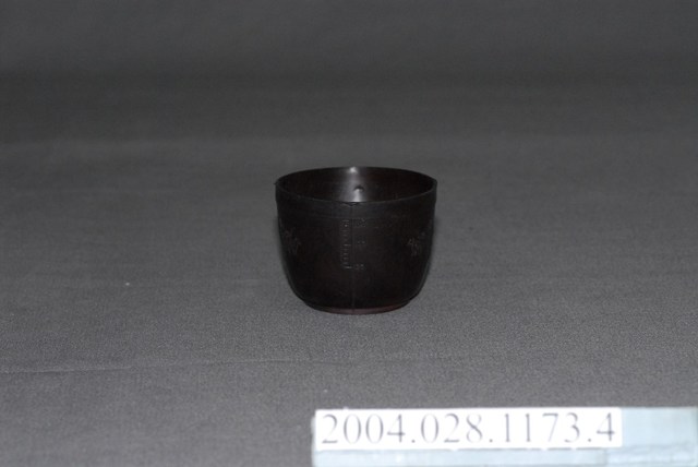 本文物為染髮劑計量用之塑膠杯,整體呈暗褐色,有握把,杯面刻有刻度,繪有龍紋。