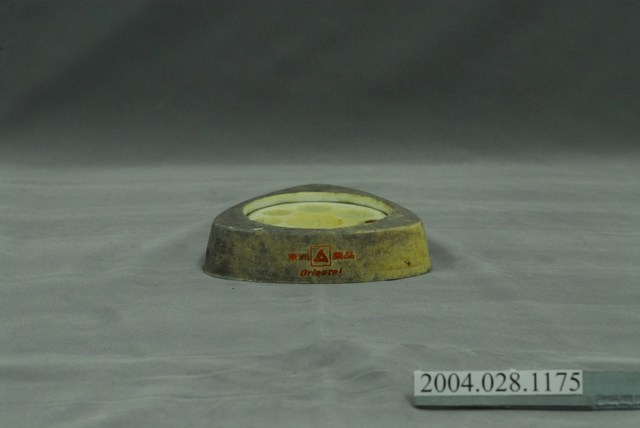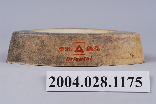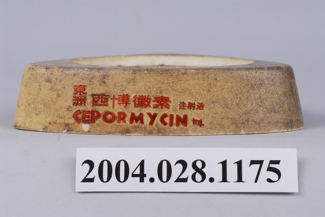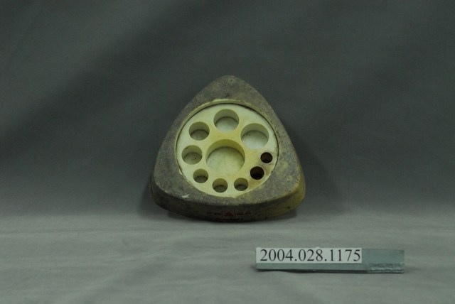 1.本物件為置藥器,塑膠製品。外型成三角狀,角為圓弧狀,無蓋。內有10個洞,可放藥丸,依大小次序排列。側邊刻有紅色字體,一面由上至下為東洲西博黴素注射液、CEPORMYCIN Inj.。另一面為東洲藥品,東洲與藥品中間有三角型商標,下方有Oriental字樣。
