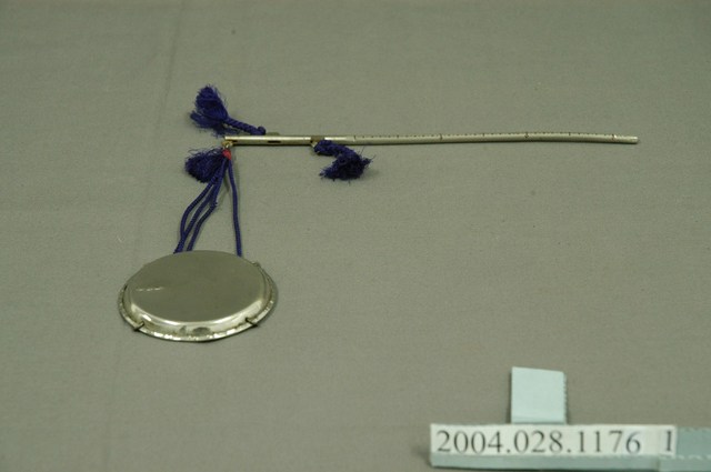 本物件為藥秤,金屬製品。藥秤可分成三部分,秤稈、圓形秤盤與秤鉤,秤盤和秤稈用紫線綁住連接。