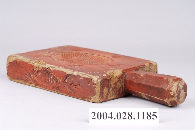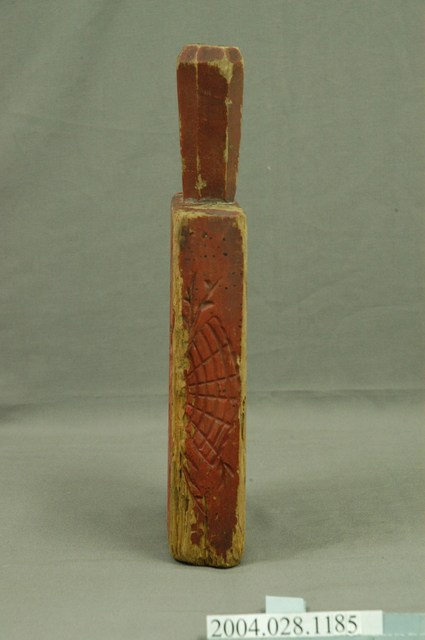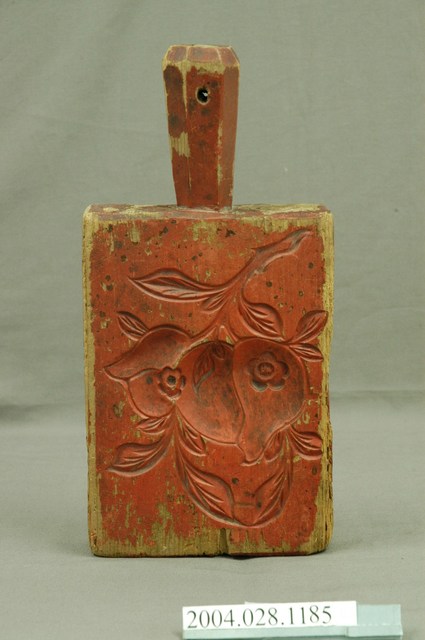 1.此印模模板上刷有朱漆,推測應是嫁妝之物。此印模一寬面刻象徵長壽的龜紋,龜甲由外至內共二圈,最外緣由二十四道圓弧形紋串連構成,外緣刻有頭、尾、五根張爪的前腳,四根張爪的後腳,龜甲刻甲殼紋,中央有三個六角框,框內各刻有「福」、「祿」、「寿」字。另一寬面刻兩粒帶枝葉的圓形桃,一大一小,桃內各雕有桃花紋,桃外周邊以桃葉為裝飾。一窄側邊雕刻魚紋與枝葉紋。另一窄側邊刻有代表多枚古代銅錢並列所組成的扇形紋與枝葉紋。握柄呈多角形,近尾端有一小穿孔,做為穿繩吊掛之用。此模具因經久使用,朱漆有多處脫落,整體呈現嚴重磨損,