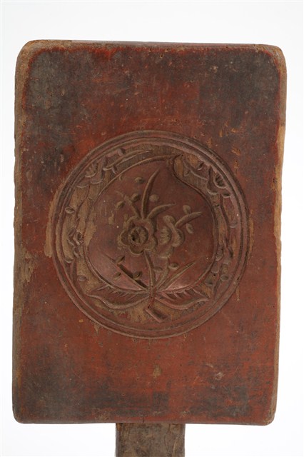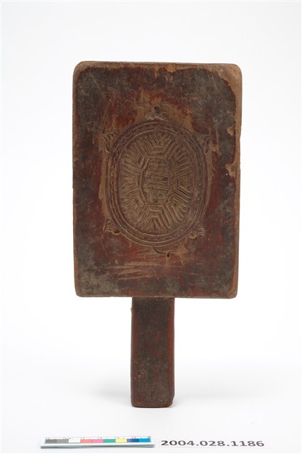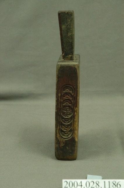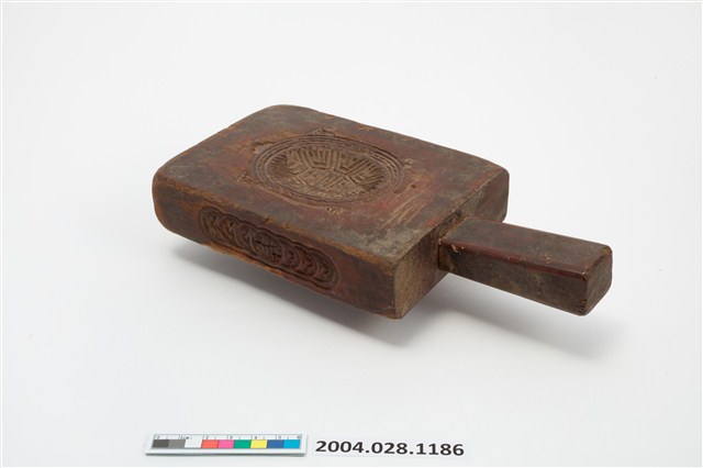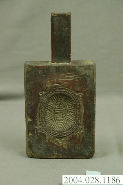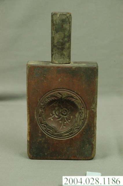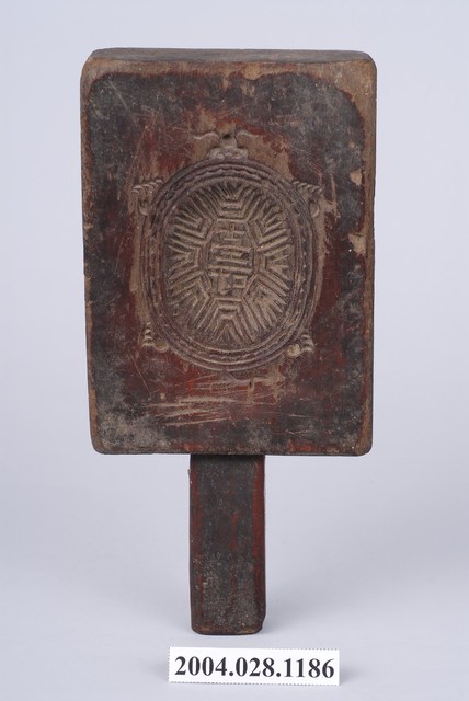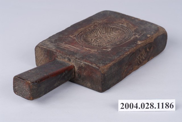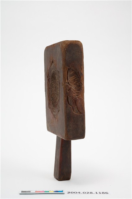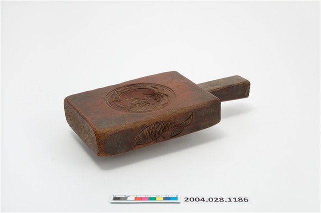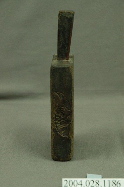 2004.028.1186 長方形四面雕龜桃連錢魚紋帶柄粿印