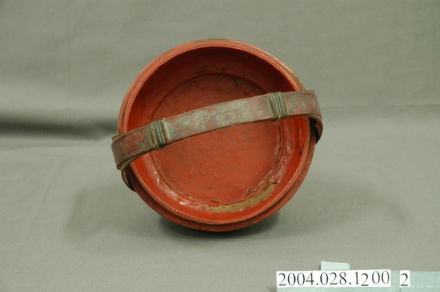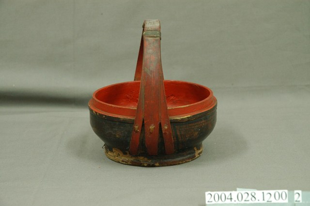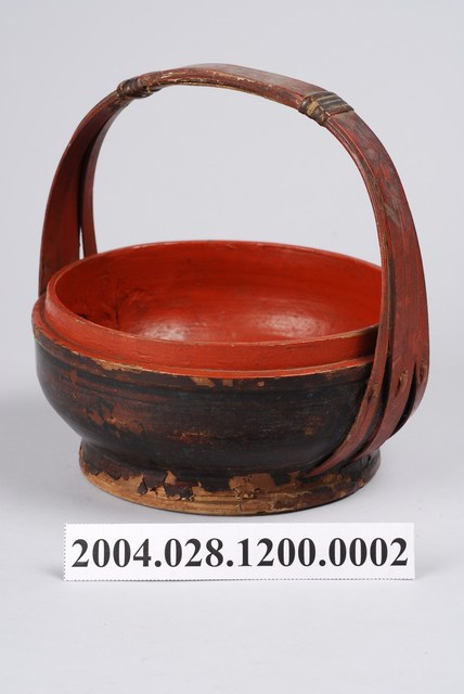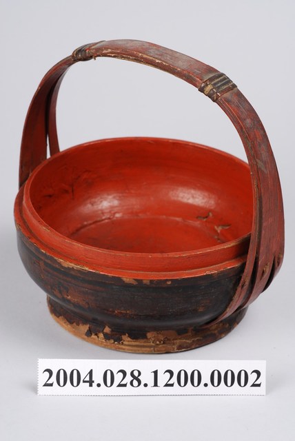 本文物為木製禮籃主體,外觀為咖啡色,底部多處顏料剝落,內部為朱紅色。竹編提把鑲嵌進禮籃主體,提取物品方便且牢固。