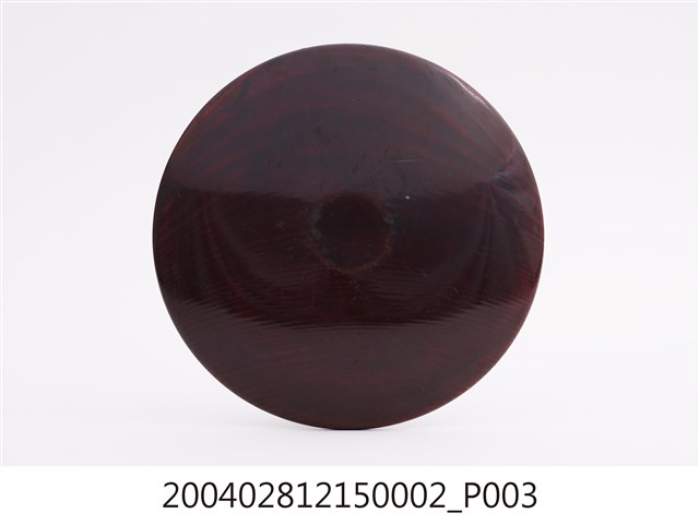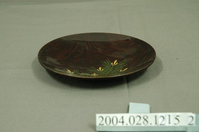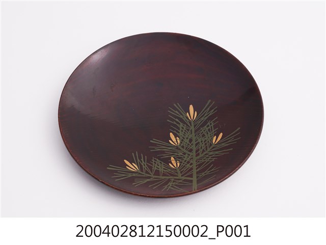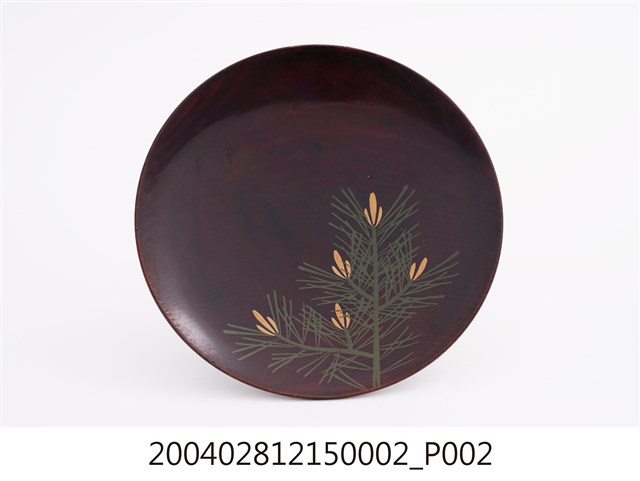 木地松葉紋漆盤,木胎,圓形,深約1.7公分,底為深褐色,木頭紋路清晰可見,盤面以綠色顏料描繪松枝和松葉,綴以鵝黃色松花,約占盤面1/3面積,其餘留白,造型簡潔素雅。