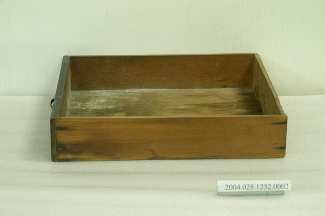 此藏品為一組兩件木製方桌的抽屜,長39.3公分、寬45.5公分,高9公分。位於方形桌板下與兩足間,正面施以清漆,其他部分不上漆,正面中央有突出金屬拉把。整體以金屬釘子固定,無任何裝,給人實用之感。