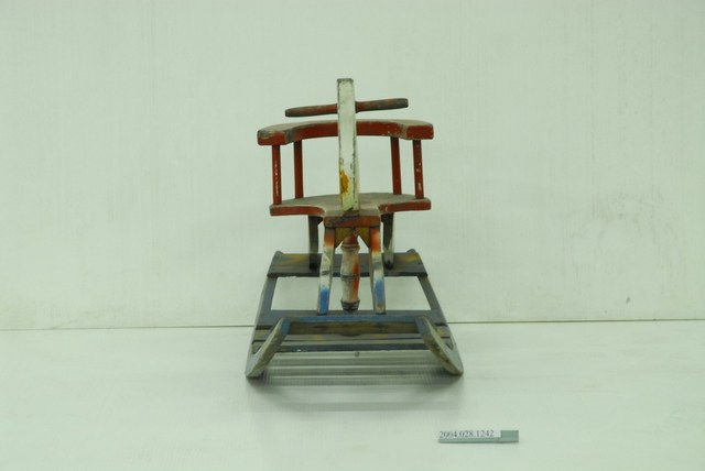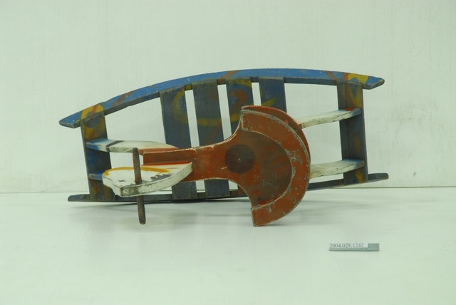 1.本物件為木製搖擺馬,材質為木質,物件上半部為木馬造型,有一類似木椅之可供人乘坐構件,有靠背,其構件下方有一支柱狀物提供與下方連接,其木椅構件下方前後各接有木腿,上方前方有木製馬頭固定,馬頭上有彩繪且有握桿,以白色為主;物件下半部為弧形底座,整體為藍色,左右各有一組,中間以四片木板相連,可供乘坐者前後搖擺。