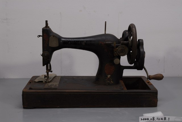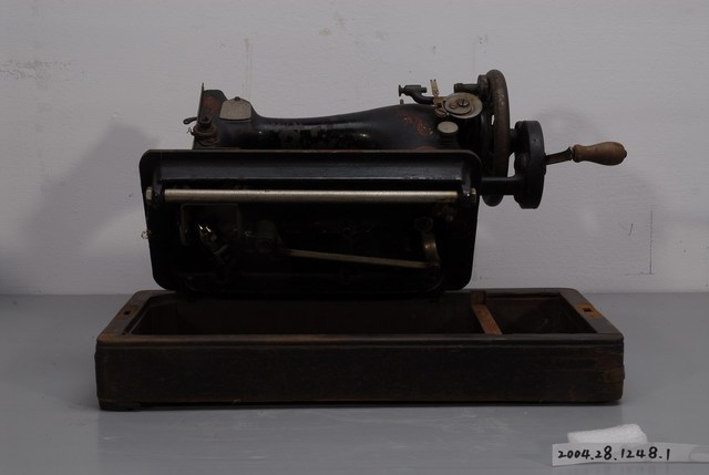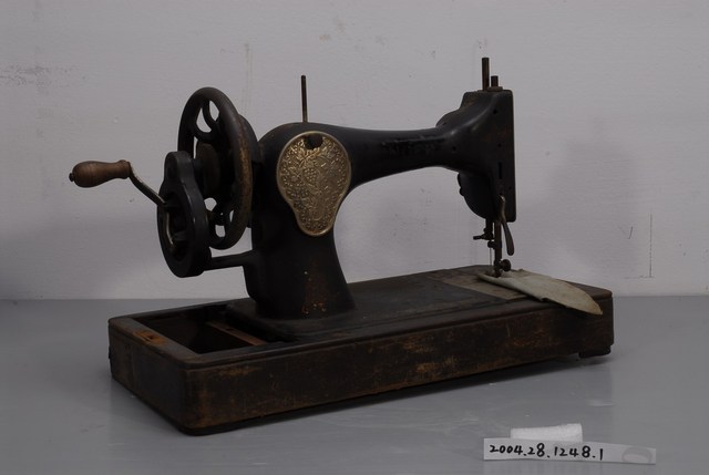 本文物為手搖式縫紉車主體,主體為金屬材質,有一輪盤上面有木製握把,其以槓桿原理使該裁縫機運作,縫紉車身一側釘有紅色的鋼印鐵牌,另一側釘有水滴狀的銀色花紋鋼印的裝飾物;下方有一木質底座。1970年英國人湯瑪斯‧聖特(Thomas Saint)為提高製鞋效率設計手搖裁縫機,在多次的改良之下,時至1853年多數家庭使用之腳踏裁縫機才出現。而傳統家庭中的縫紉工作多由女性擔任,因此縫紉機出現反映女性生活與科技互動,所產生工作型態之改變。