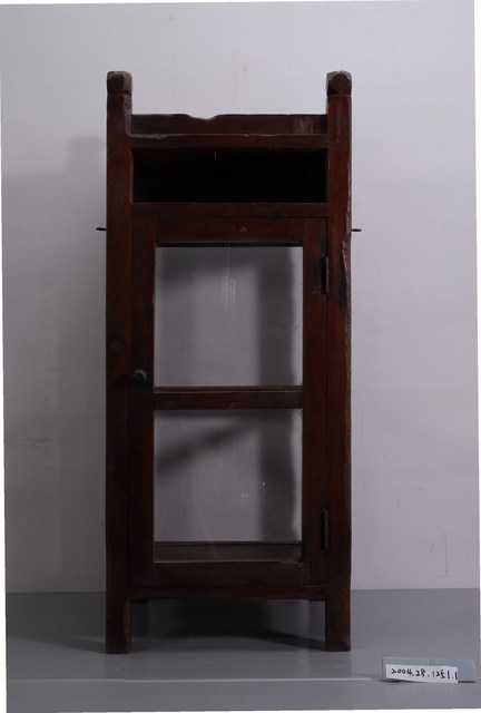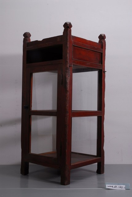 1.本物件是「什細擔仔」的木製櫃體,外觀呈直立式長方體。木櫃底部有4隻櫃腳,一共有3層置物空間:底部2層皆為4面鏤空的玻璃櫥窗,1面有櫃門可開啟;最上層置物空間為拉取抽屜式。