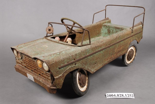 1.本物件為綠色鐵製汽車玩具,玩具車前有車牌,車上有一方向盤,車體的最後兩邊有欄杆扶手,車體的前車燈是一橘一白的配置,車體本身有多處鏽蝕。