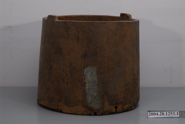 1. 本件為附蓋木桶的主體,器形呈梯形,圓筒狀,直腹,底部較寬,口部較窄,圓平底,立耳。整體有使用過的碰撞痕跡與污痕,桶身則具刀刻痕跡,刻痕多呈短橫線排列,分佈於整器表面。木桶有至少三道較大的直向長裂痕,裂痕從器底損裂至器腹,其中一較大的裂痕已形成破洞,其上以鐵片做補丁,以修補防漏。底部邊緣稍微被腐蝕,產生片狀缺損。2. 在塑膠與鋼鐵尚未普及之前,臺灣早期民生用品中很常見以木材製作桶裝用具。一般來說所用木材以價廉耐用的杉木類木材為主,也常見檜木及肖楠。木桶的用途多元,常見作打水桶、洗臉盆、浴桶,炊煮用的飯甑,以及盛飯用的飯斗等等。此外,木桶也用作貯藏器具,大型如木製米缸、醃菜桶,小則有醬油罐等等。本件文物推測屬於貯存用的木桶。