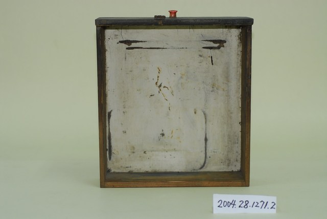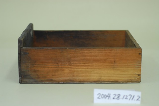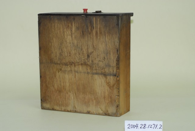 1.本物件為香腸彈珠臺抽屜,木頭製,作為收集已記分彈珠之用。抽屜底板為薄薄的木層板,內側底部白色已有部分脫落,抽屜外有把手及鐵片鎖。