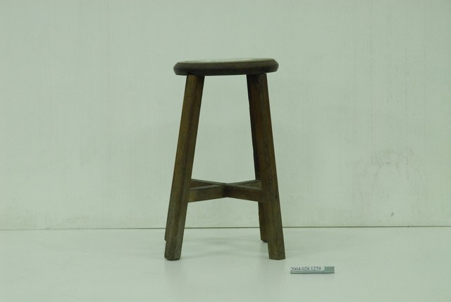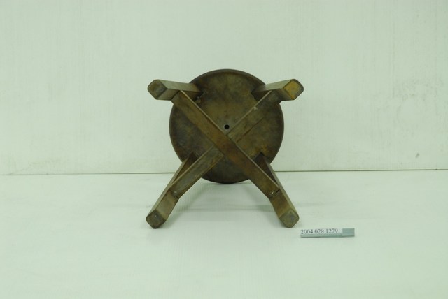 1. 本藏品為木製圓凳,長43.1公分、寬44.2公分、高53.8公分,圓形的凳面下方有四支外張的凳子腳,四腳之間則有兩支交叉的方棖。凳面上鑲嵌有一方形的花磚,中間繪有粉紅色的水仙花。水仙花有長壽成仙之意,是傳統的吉祥圖案。2.本件作品鑲有花磚,花磚是日治時期由日本引進臺灣,故可推知此藏品當屬日治以後之作品。